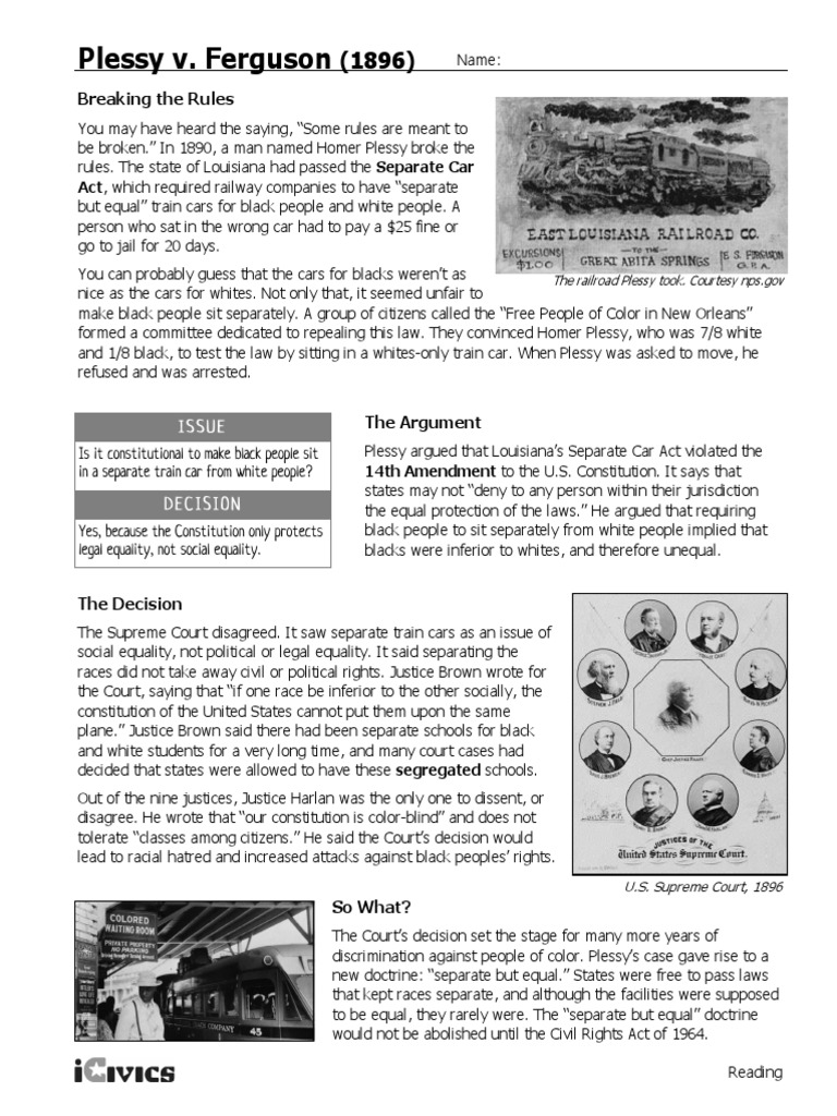 Try to remember, you always have to care for your child with amazing care, compassion and affection to be able to help him. He has been actively involved with the ap reading as a grader for the past 3 years having scored the. Ferguson worksheet pictures collection can be a guide for you, deliver. When we talk about plessy v. Ferguson separate our goal is that these plessy v. Ferguson was a landmark 1896 united states supreme court decision that had wide ranging implications regarding the legality of racial segregation interesting plessy v. They will examine homer plessy and the citizens' committee's plan to challenge racial segregation and the long term impact of the supreme court's ruling. Reading and worksheet describing the circumstances and impact of the plessy v ferguson case. It basically defined racial policy in the period between reconstruction and the civil rights movement. The impact of this decision was huge. Worksheet will open in a new window. Published with reusable license by. Ferguson exemplifies the systematic denial of african american civil rights even after the 13th amendment abolished slavery in 1865.